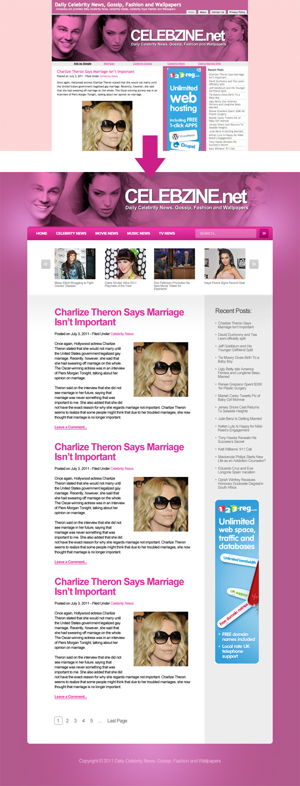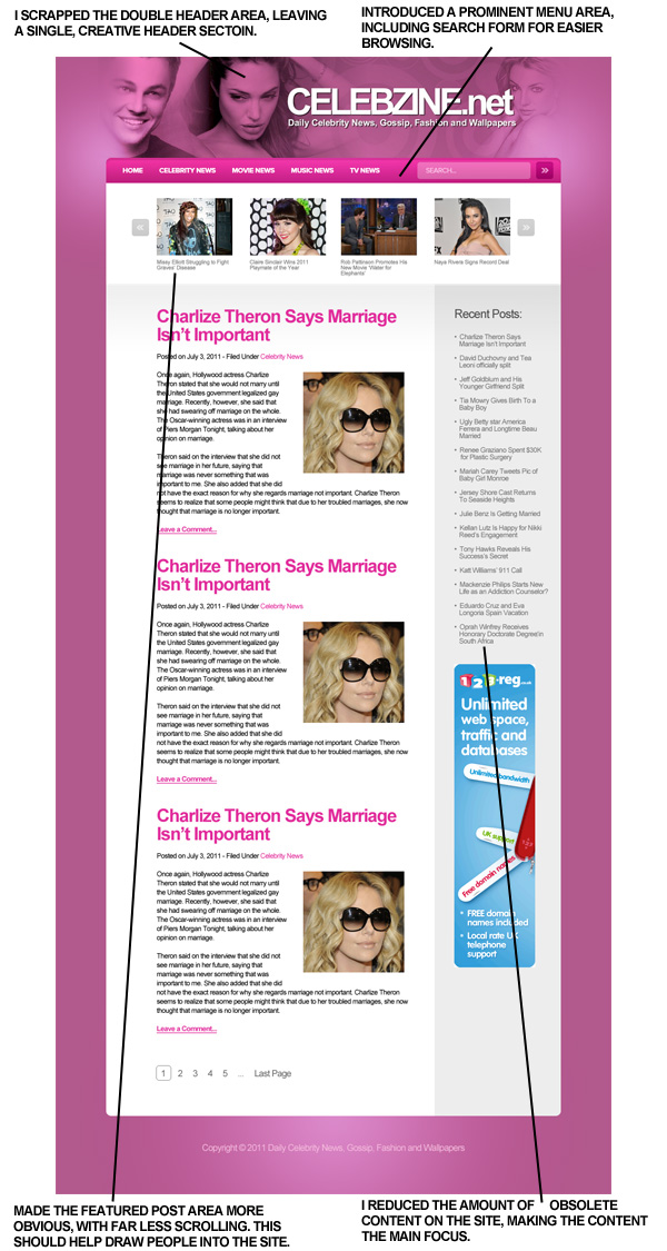 As always, I was limited by the 30 minute time-frame, but I tried to improve upon several of CelebZine’s features, adding a few design flourishes and a clearer layout that promoted content over wasted space: