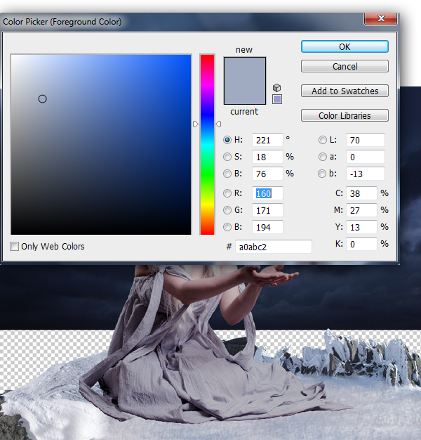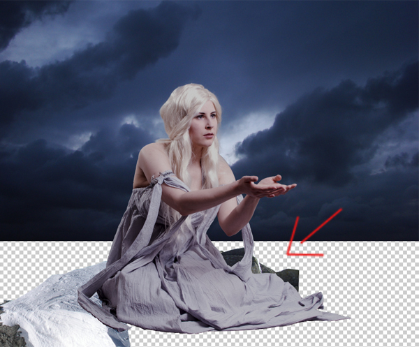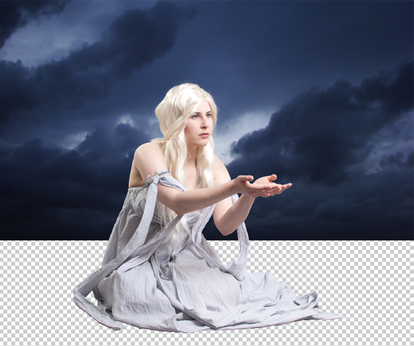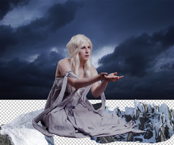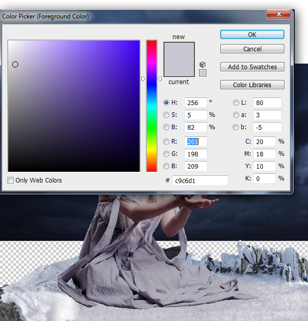 In this step we are going to place the sky in the background and color correct the princess to match with the BG sky using Adjustment Layers.