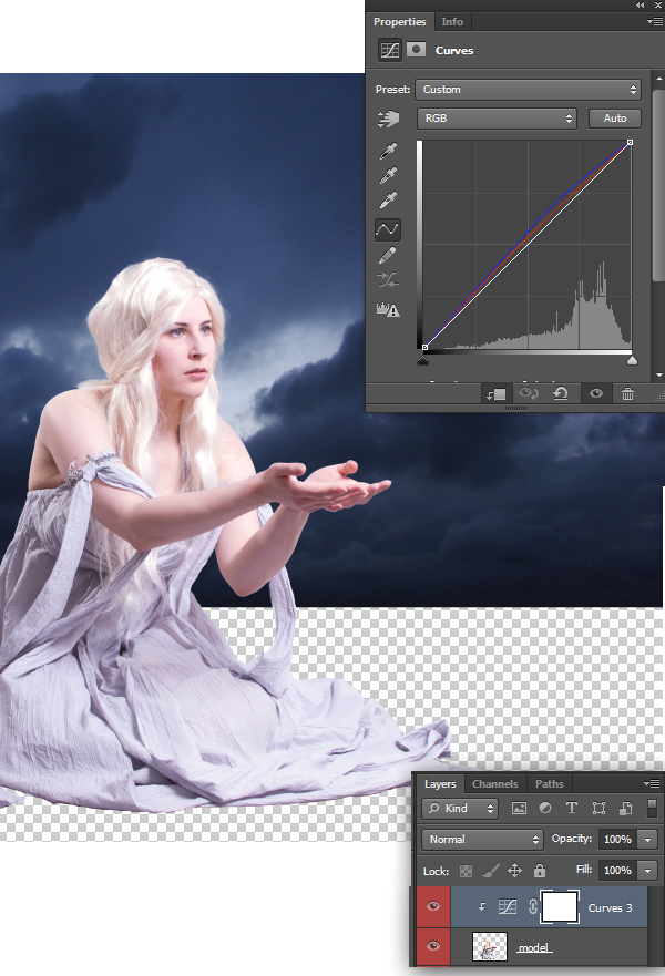 2) Now create an Adjustment layer of Curves to the princess layer and set the RGB curves as shown.
