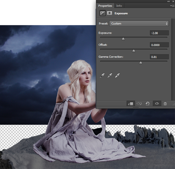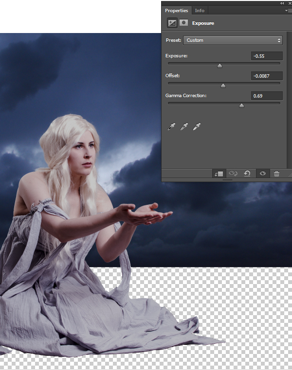 5) Now by using the Exposure Adjustment layer set the Exposure to -0.55, Offset to -0.0087 and Gamma Correction to 0.69.