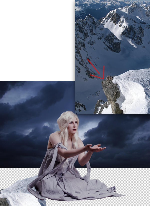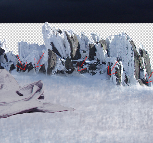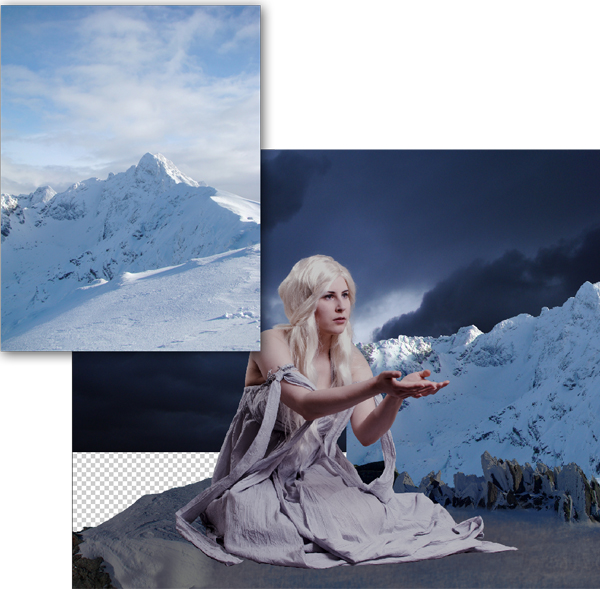 1) Cut the image of the snow covered hill from the stock photo and place in the background as shown.